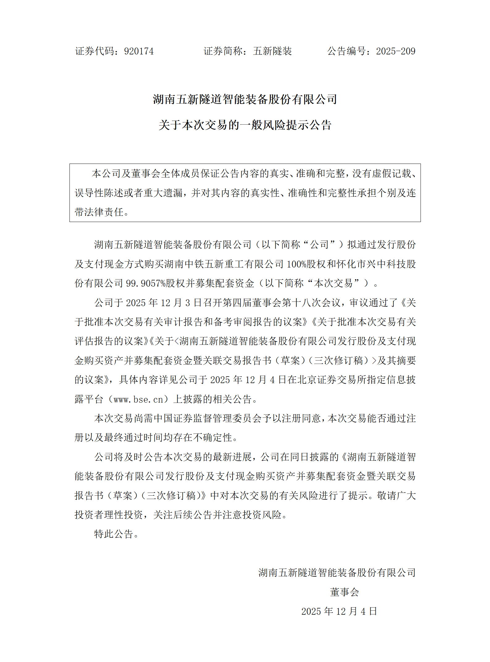 2025-209 五新隧装 关于本次交易的一般风险提示公告