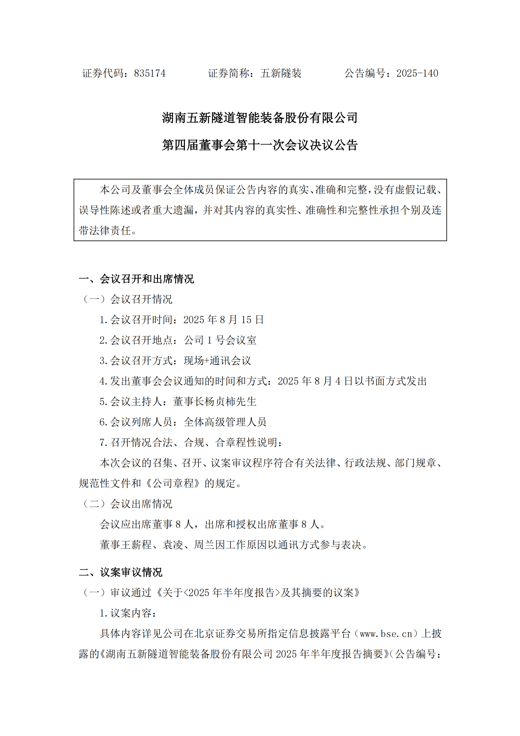 2025-140 五新隧装 第四届董事会第十一次会议决议公告