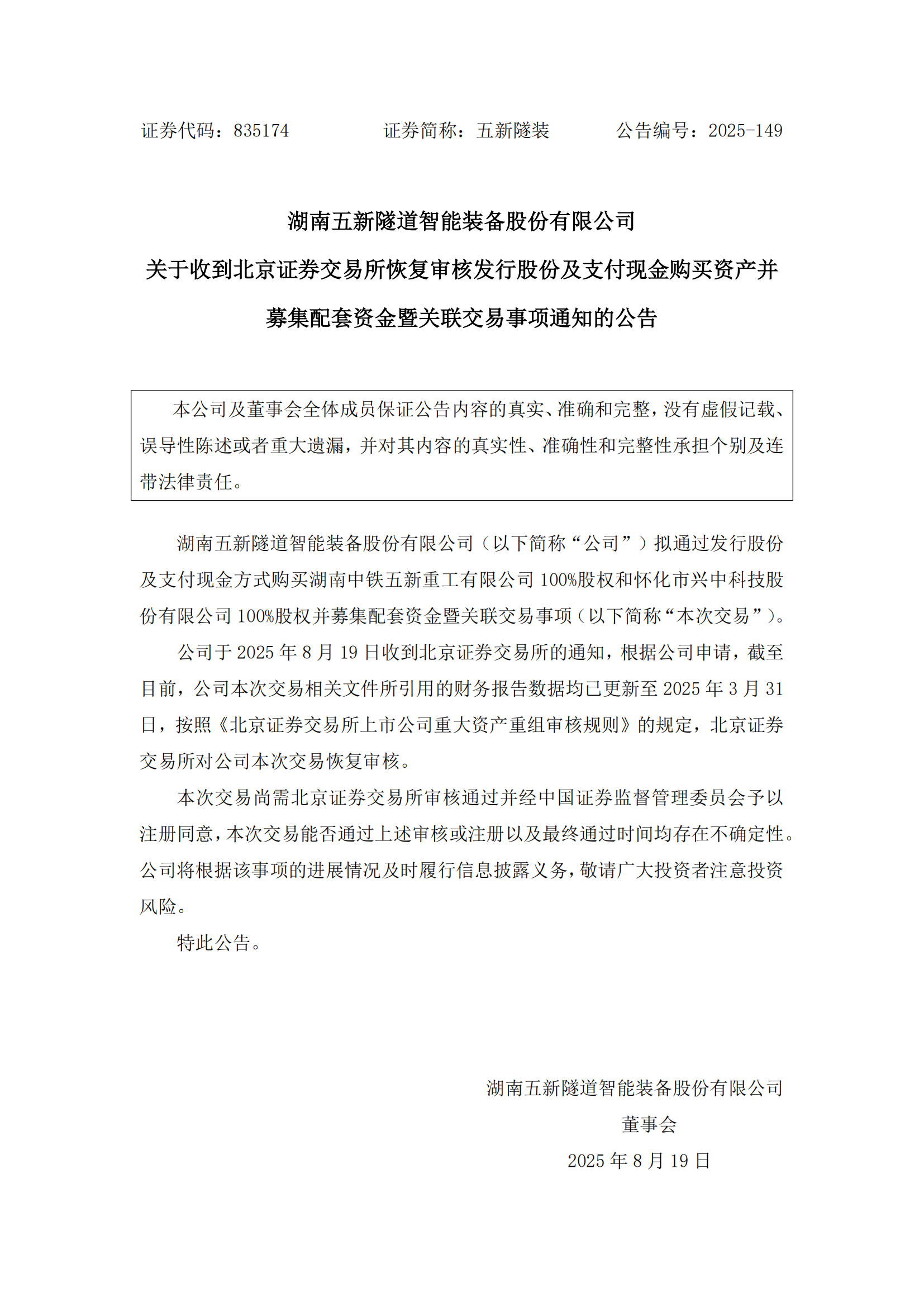 2025-149 五新隧装 关于收到北京证券交易所恢复审核发行股份及支付现金购买资产并募集配套资金暨关联交易事项通知的公告