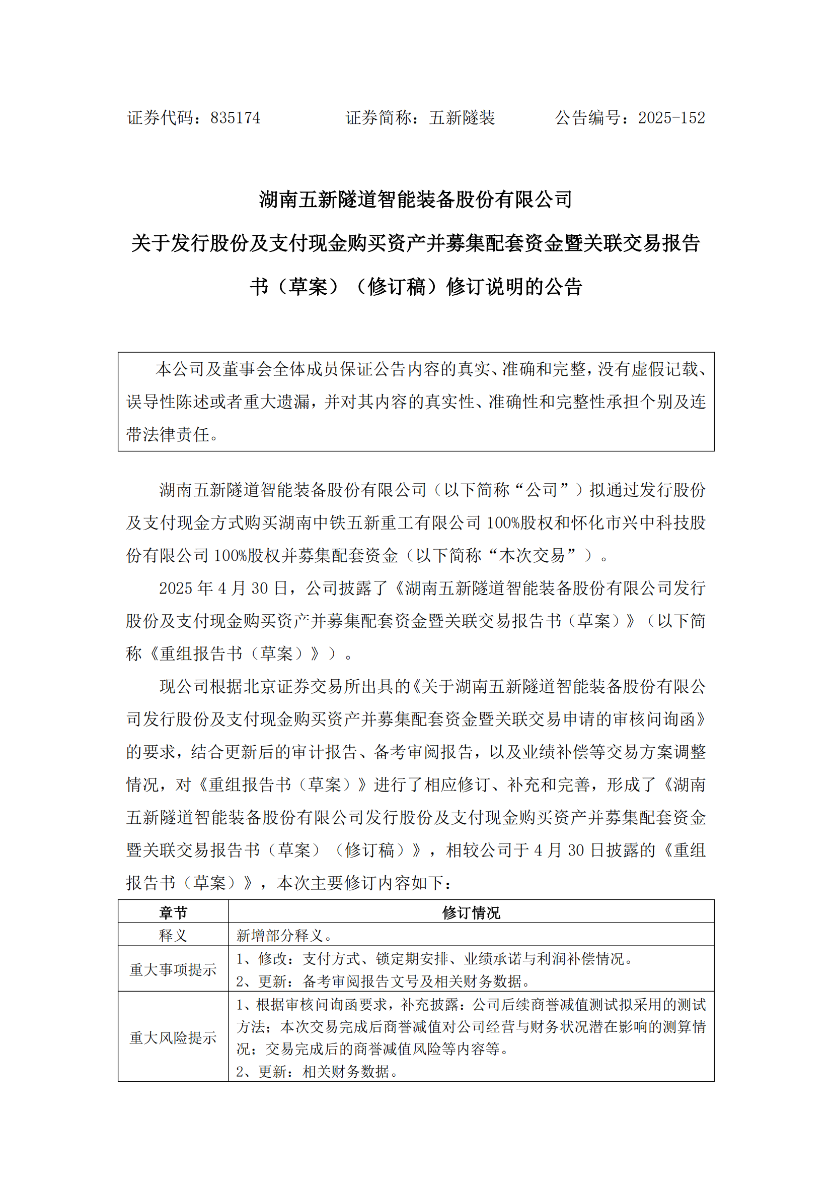 2025-152 五新隧装 关于发行股份及支付现金购买资产并募集配套资金暨关联交易报告书(草案)(修订稿)修订说明的公告