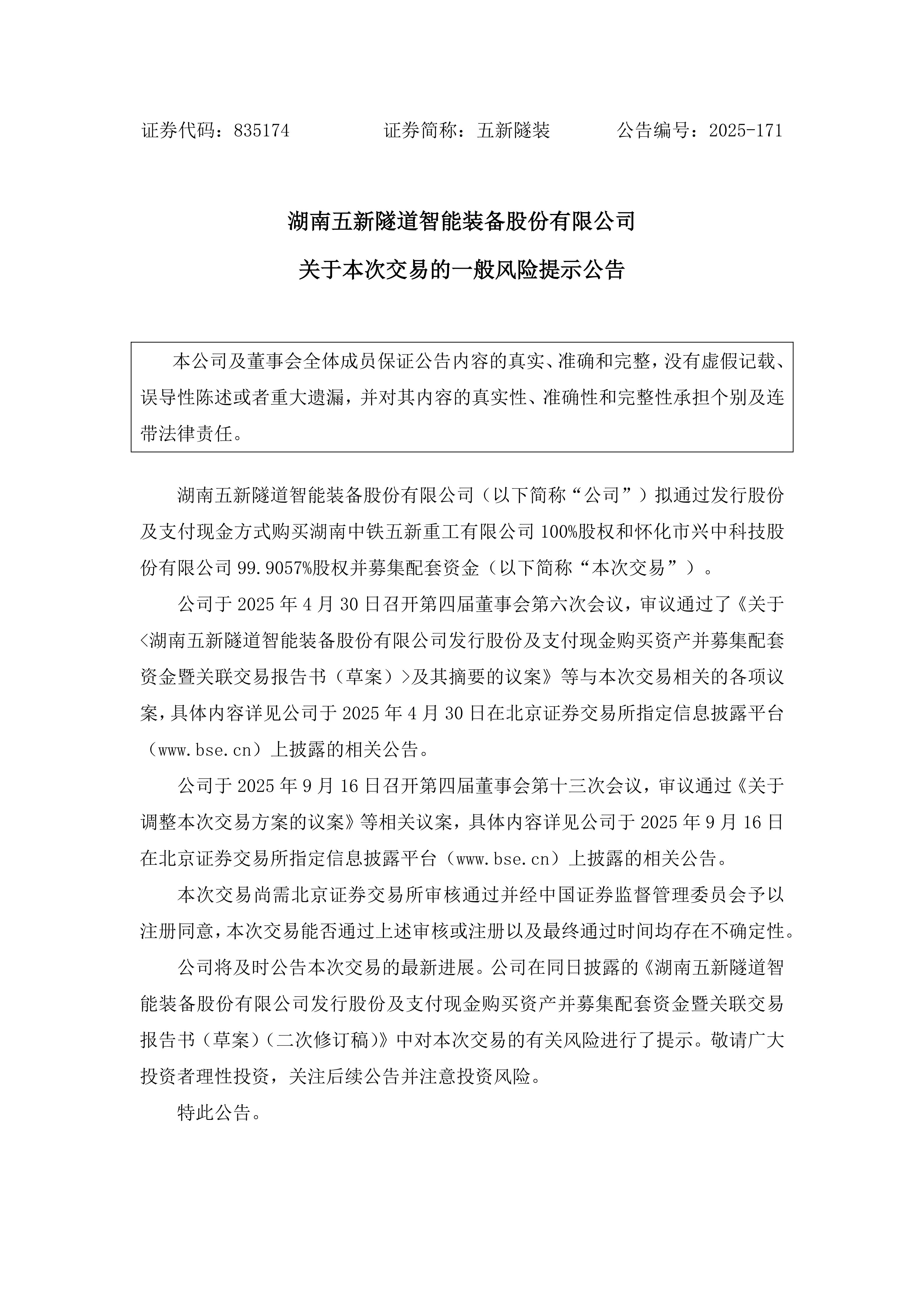 2025-171 五新隧装 关于本次交易的一般风险提示公告