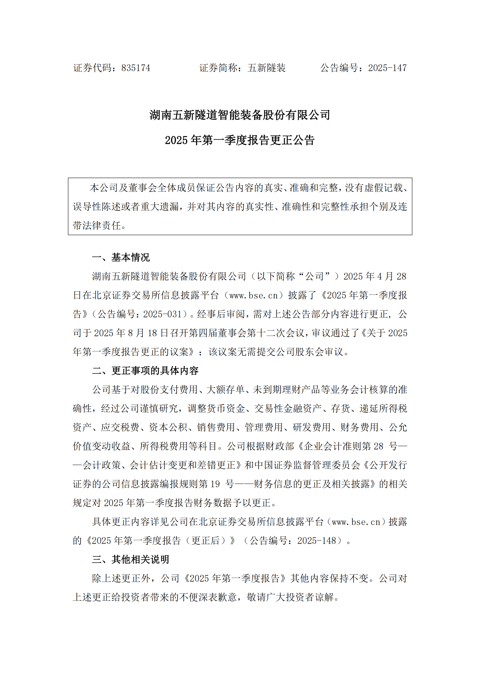 2025-147 五新隧装 2025年第一季度报告更正公告