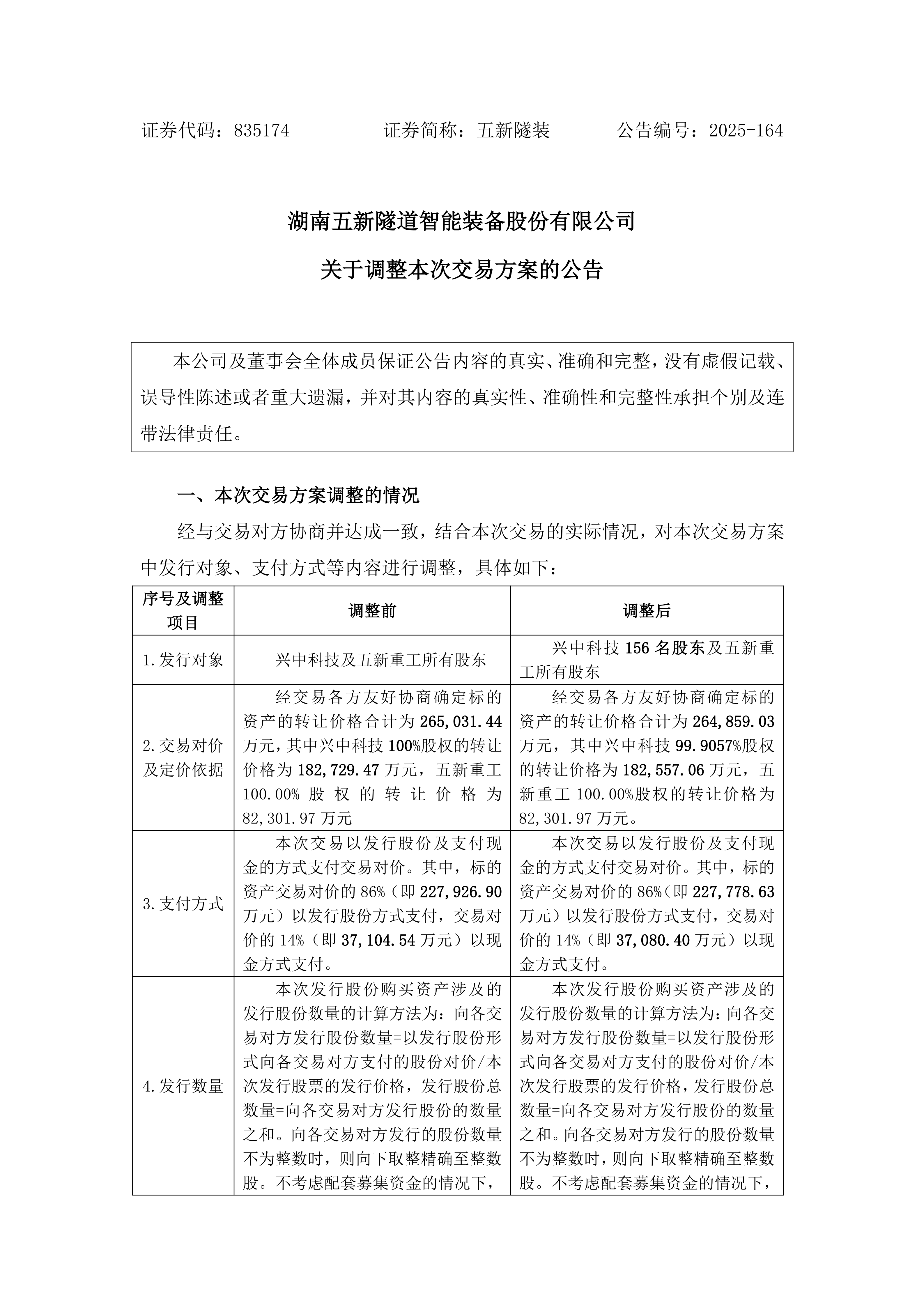 2025-164 五新隧装 关于调整本次交易方案的公告